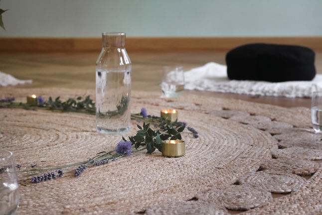 Wir bieten euch Yoga- Matten, Decken, Meditationskissen, Stühle, Kissen, dimmbare Lampen und Kerzenschein.
